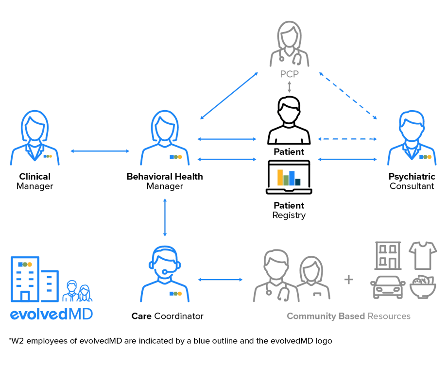 A great example of this approach in action is evolvedMD, a collaborative care company based in Scottsdale, Arizona uses a hybrid approach to improve access, engagement and integration of behavioral health into physical healthcare.